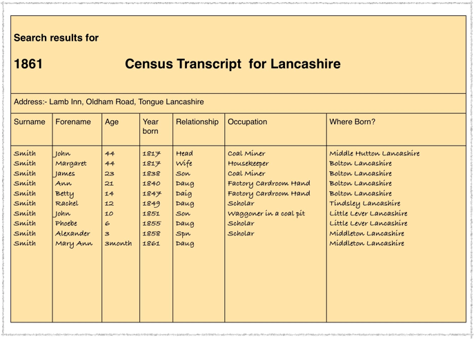 Because James snr described himself as a Coal Miner born in Bolton, I looked for him in the 1861 Census and found the following.
