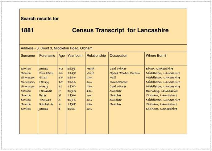 The first mention of my grandfather James is in the 1881 census when he was 1 year old. Living in Middleton Road Oldham with his parents and siblings and, this was a surprise, his step brothers and sisters. His father, also James and I now name James snr. to avoid confusion, appears to have married a widow with three children. Elizabeth had previously been called Simpson and her children Eliza, Harry and Mary all had that surname. Between Mary’s birth in 1870 and Hannah in 1873, she married James Smith and the subsequent children all have Smith as their surname. Hannah, Peter, Thomas, Rachel A and James.