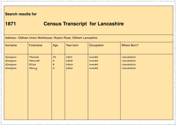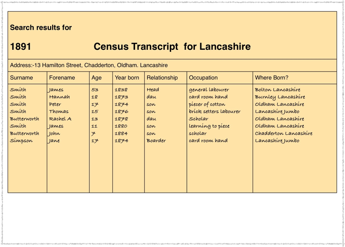 Jane Simpson could be a niece, she is the same age as Peter. I need to look at the Butterworth connection. I think there is an error on the 1891 return and Rachel A Butterworth is Rachel A Smith. Note year of birth. Perhaps John is a Butterworth and the enumerator wrote Rachel’s surname incorrectly. John is the right age to be Eliza’s son.